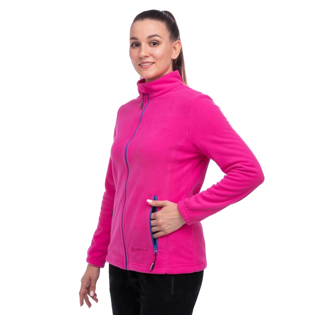 Эргономичный крой учитывает особенности женской фигуры, обеспечивает свободу движений, а приталенный силуэт подчёркивает женственность. Высокий воротник-стойка из двух слоёв флиса защищает шею от продувания, а центральная молния с защитной планкой у подбородка предотвращает натирание. Внизу предусмотрена утяжка с эластичным шнуром и фиксаторами внутри карманов для сохранения тепла.