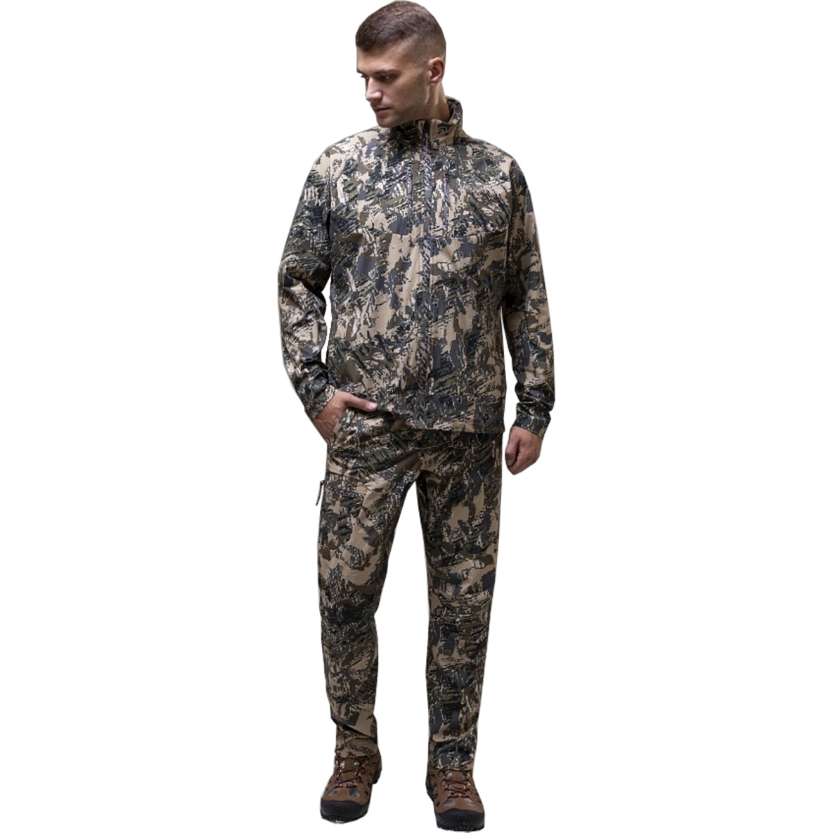 Костюм оснащён восемью карманами: по четыре на куртке и брюках, что позволяет удобно разместить личные вещи. Встроенный в воротник капюшон и маскировочная маска обеспечивают дополнительную защиту от осадков и ветра, а также помогают замаскироваться в природных условиях.
